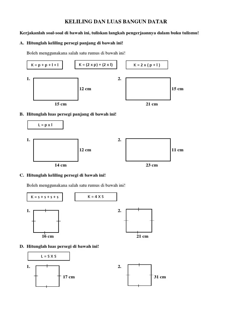 Rumus luas keliling persegi panjang. Ketika sepeda dikayuh, roda tersebut berputar sebanyak 30 kali. Penyelesaian soal ini dapat menggunkan rumus sederhana : Sebuah kain mitela berbentuk segitiga sama kaki dengan panjang sisi yang sama 14 cm dan panjang sisi lainnya 25 cm. Rahaju (2008:252) bangun datar adalah bangun yang mempunyai dua dimensi yaitu panjang dan lebar tetapi tidak mempunyai tinggi dan tebal.